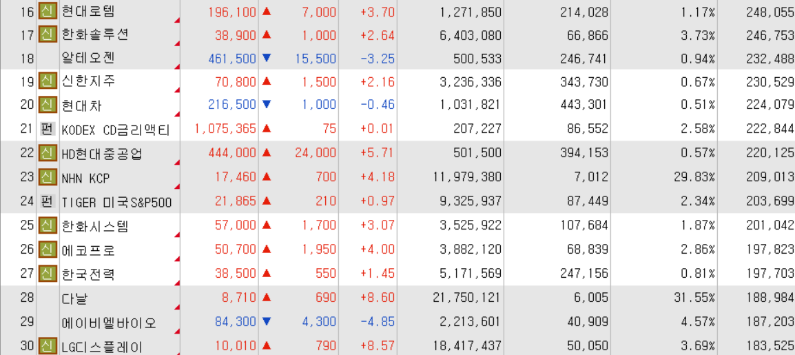 외국인과 기관이 각각 2689억, 1104억 순매수. 거래대금은 9조 7686억으로 3조 가량 줄어듦.