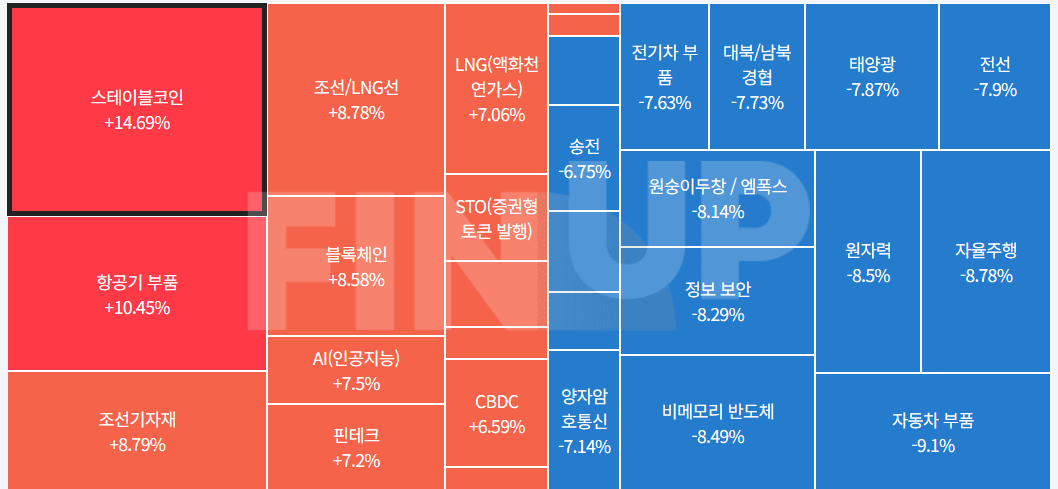 오늘 호실적이슈로 조선기자재 및 조선주가 상승을 보였고 스테이블코인 관련주가 다시 상승을 함.
