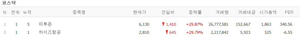 오늘의 상한가 종목은 2종목임. 스테이블코인 관련주와 항공주.