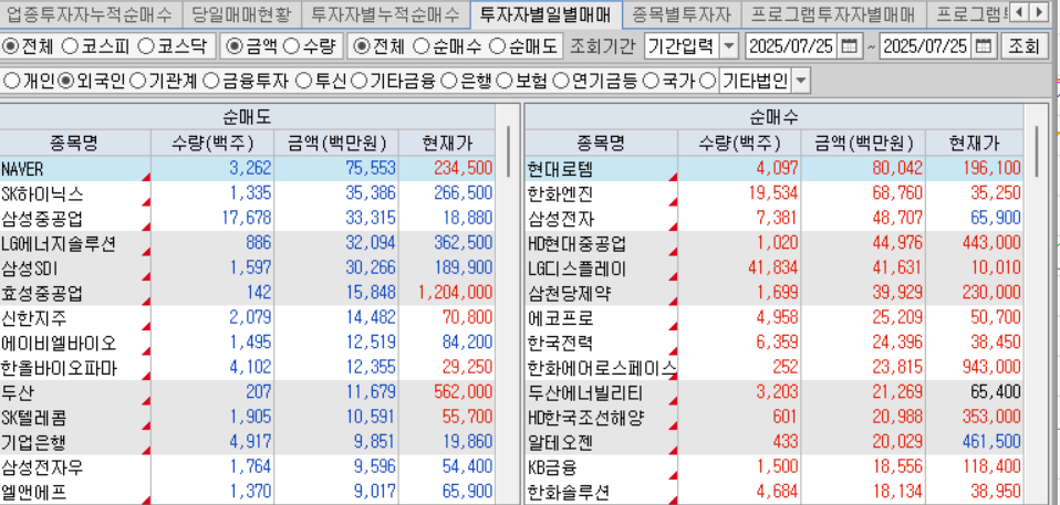 오늘 외국인 순매수는 방산,조선기자재, 제약바이오, 전력, 태양광, 금융, 2차 전지 등을 순매수