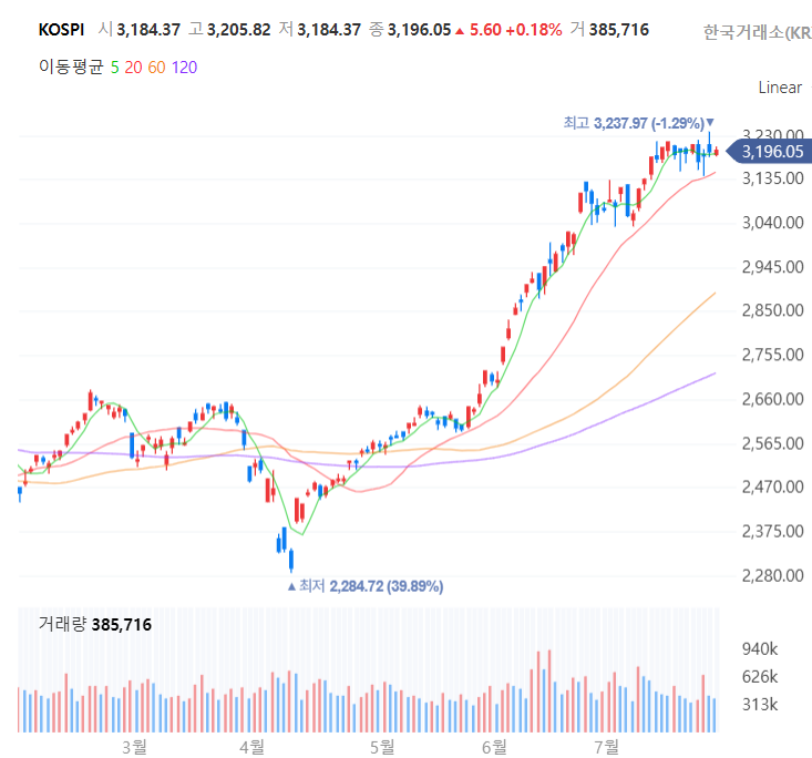 코스피 지수는 0.18% 상승한 3196.05로 3200은 실패로 마감.