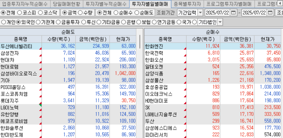 오늘 외국인 순매수는 조선, 전력, 제약바이오, 식품, 지주사, 2차 전지 등을 순매수함.