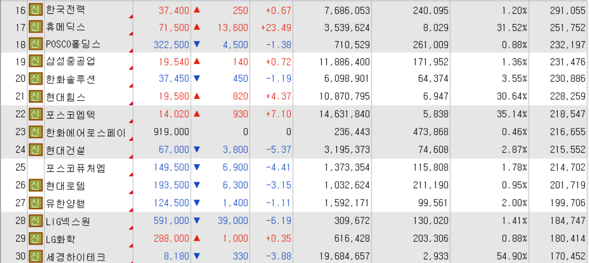 시가총액 상위 종목에서는 2차전지, 방산, 조선, 전력, 보험 등이 소폭 상승했고 대부분 하락마감.