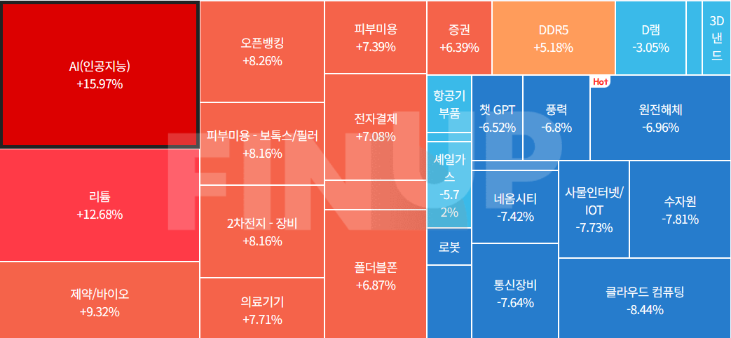 AI 관련주들이 크게 상승을 보였고 폴더블폰 관련주도 상승을 보임.