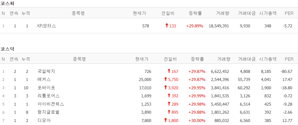 오늘 상한가 종목은 8종목이지만 절반이 소형주 임. 동전주와 시총 500억 이하는 제외함.