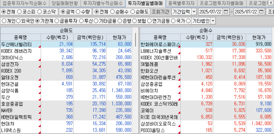 기관 순매수는 방산, 2차전지, 제약바이오, 폴더블폰, 조선기자재 등을 순매수