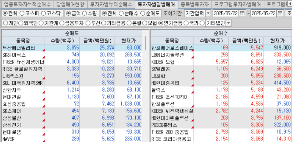 연기금 순매수는 방산, 통신, 태양광, 2차 전지, 조선 기자재 등을 순매수