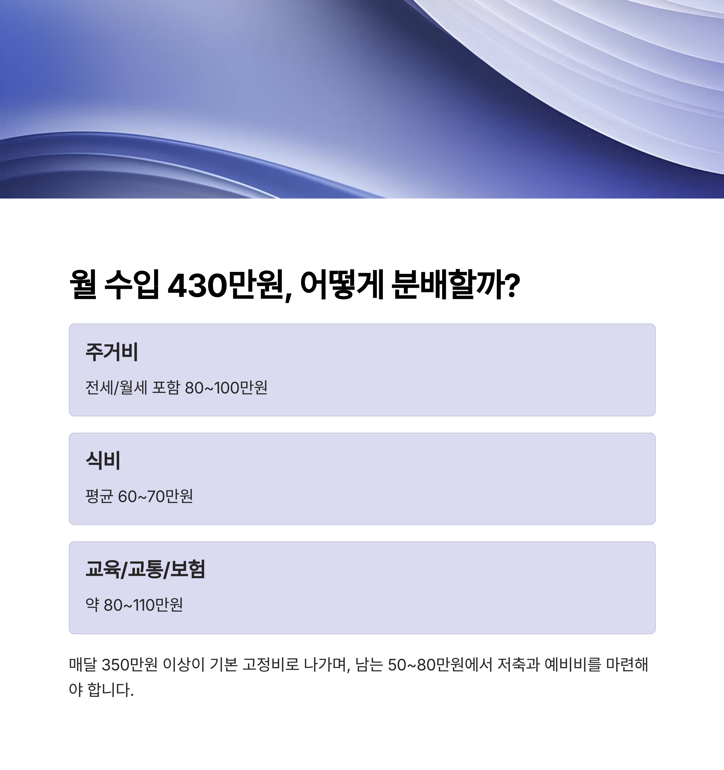- 교육비: 아이 학원비, 독서실비 등 약 30~50만원