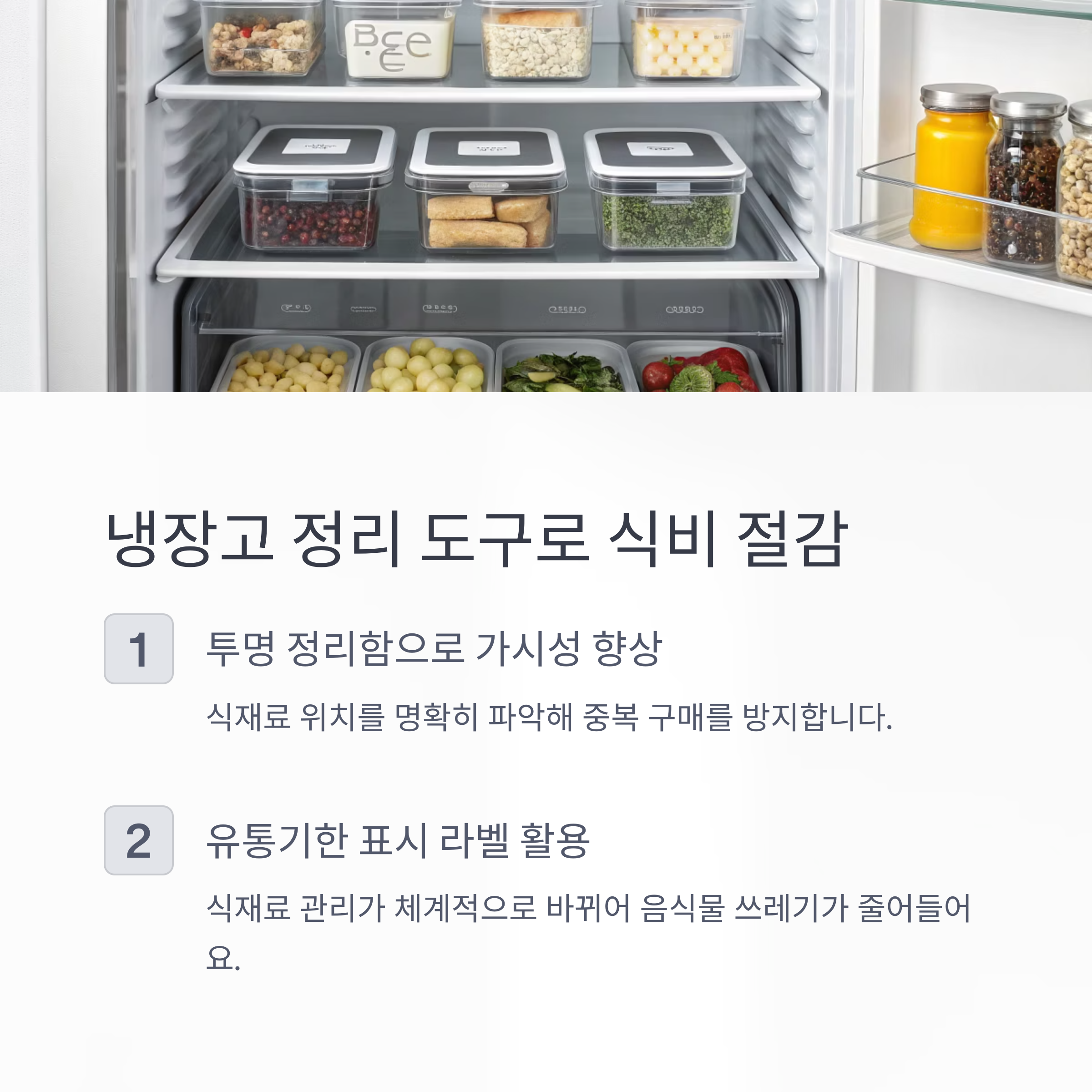 투명 식재료 정리함이칸칸이 구분된 보관 도구, 그리고 유통기한 표시 라벨 등을 활용하면