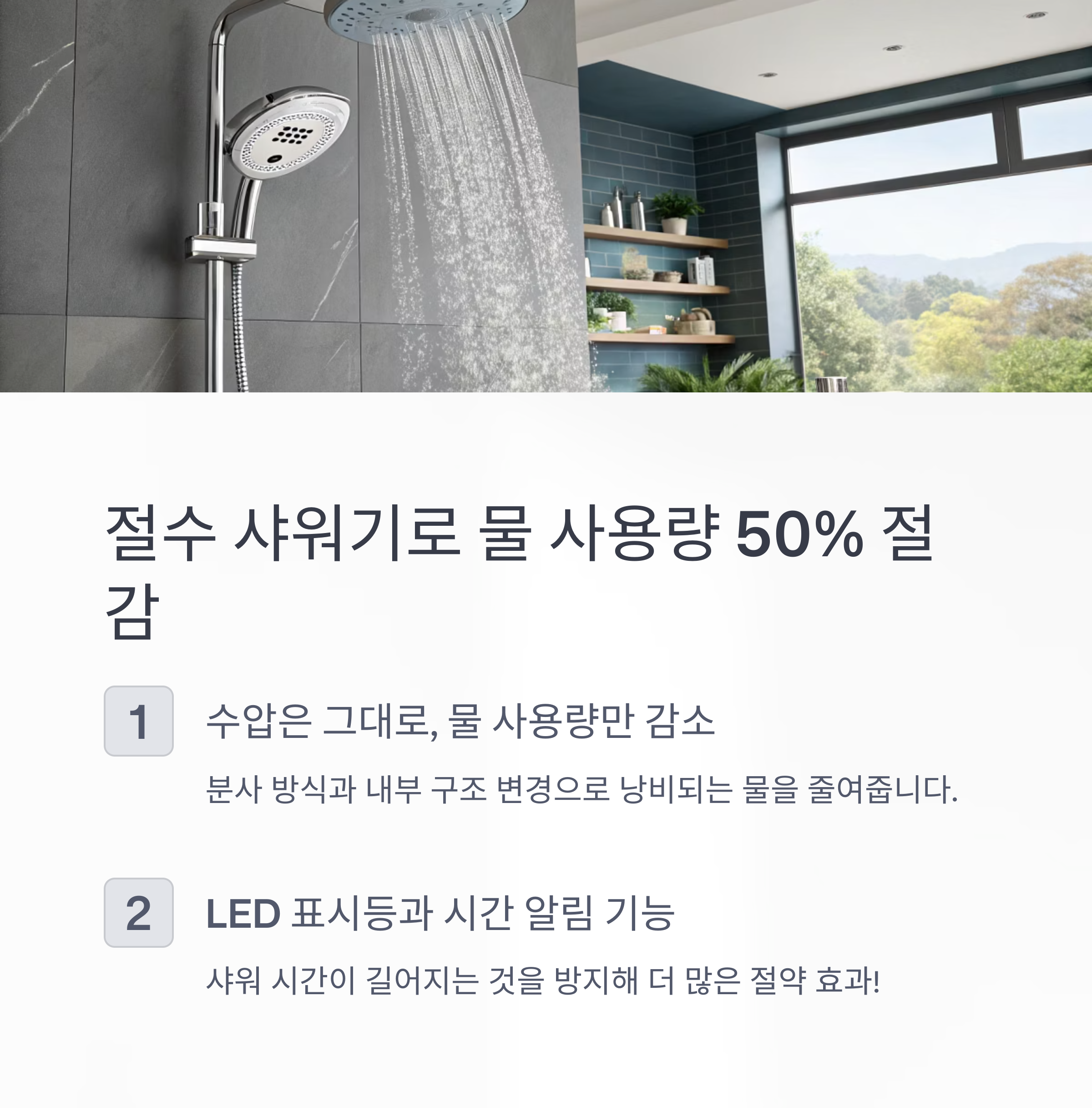 기존보다 최대 50%까지 물 사용량을 줄일 수 있습니다. 수압은 그대로 유지되면서도