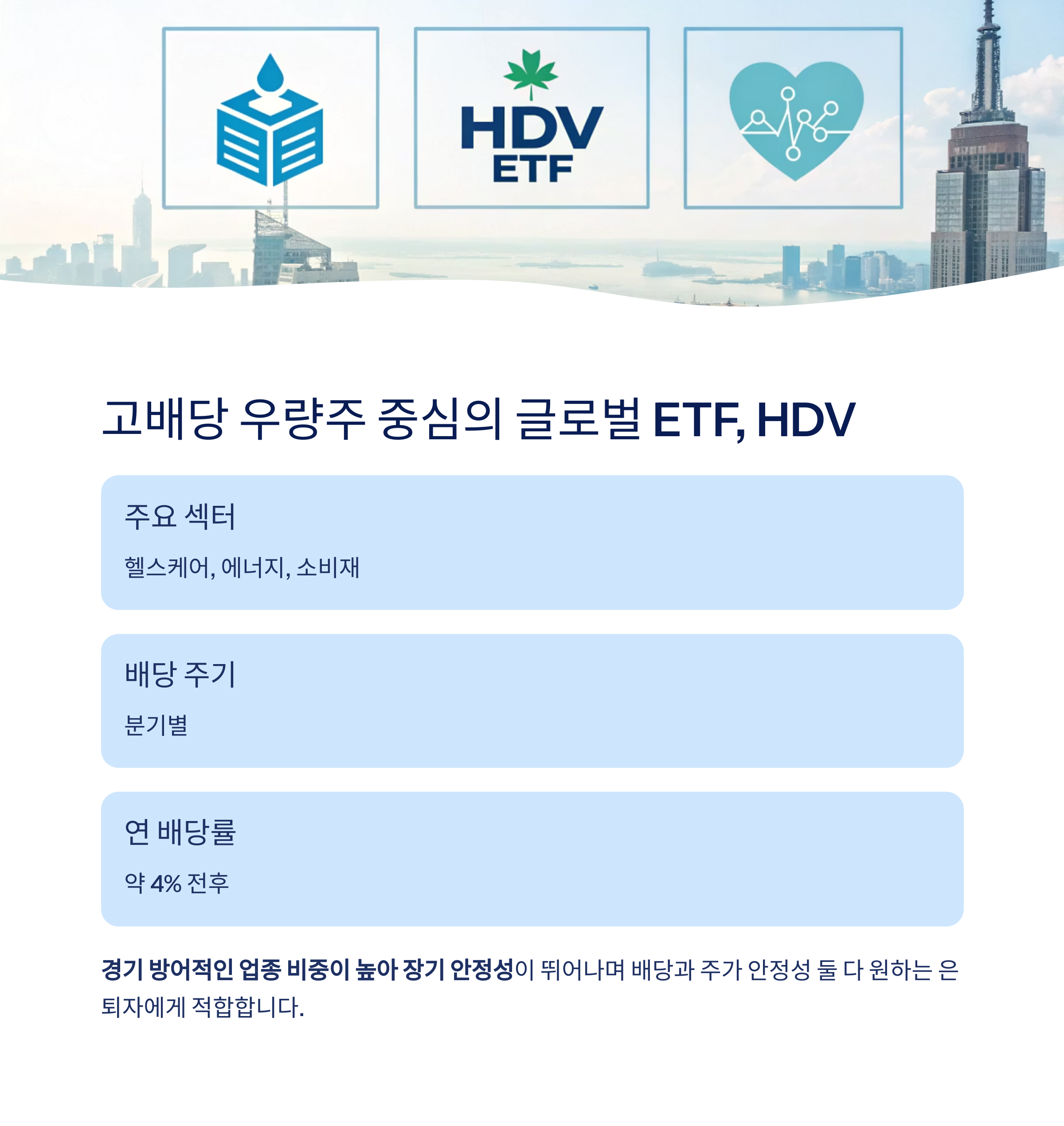 HDV | 분기 | 약 4% | 고배당 우량주 중심 안정 포트폴리오 |