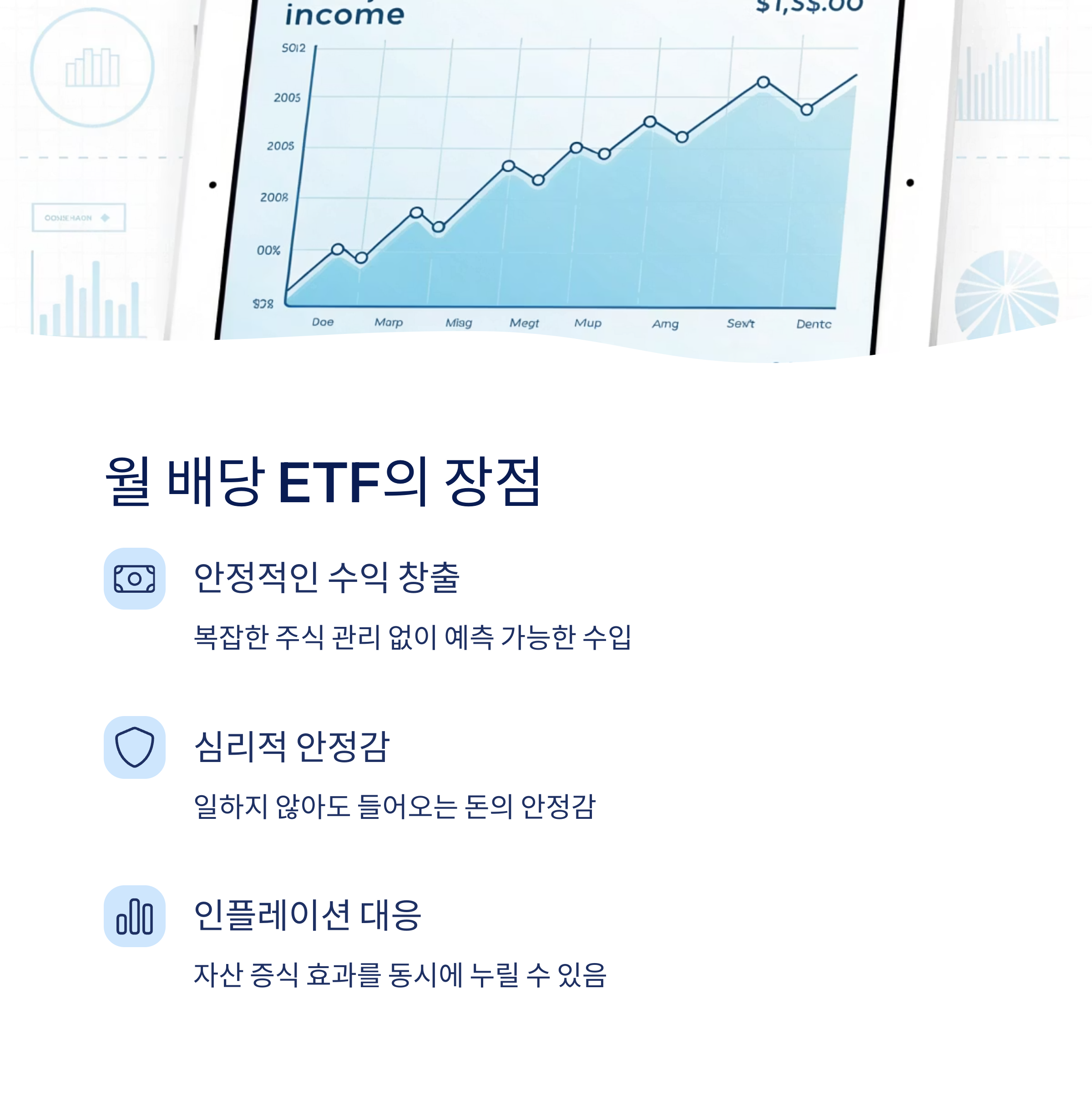특히 매월 배당을 지급하는 ETF는 월급처럼 예측 가능한 수입을 제공합니다.