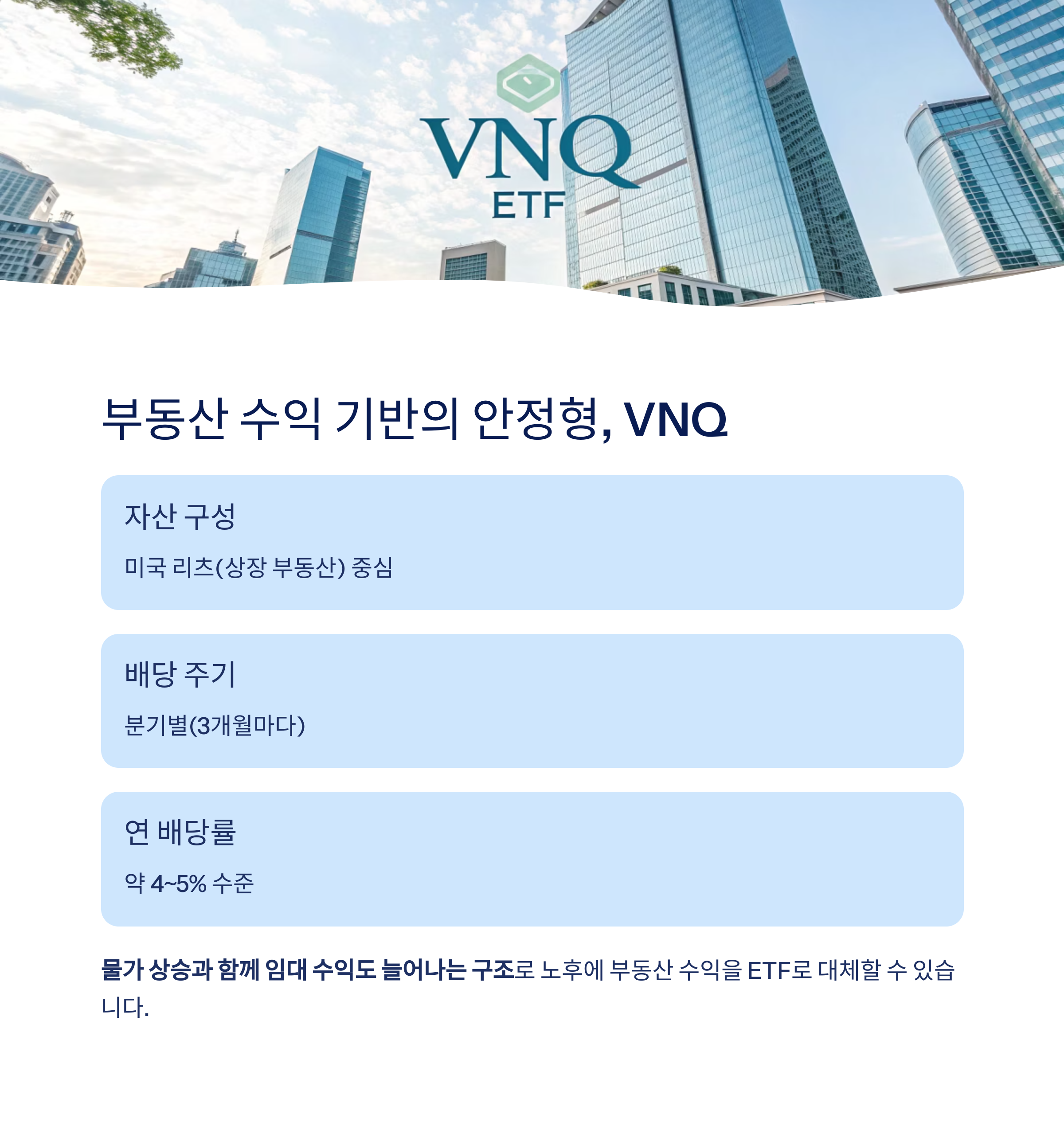 VNQ | 분기 | 4~5% | 리츠 기반의 부동산 배당 ETF |