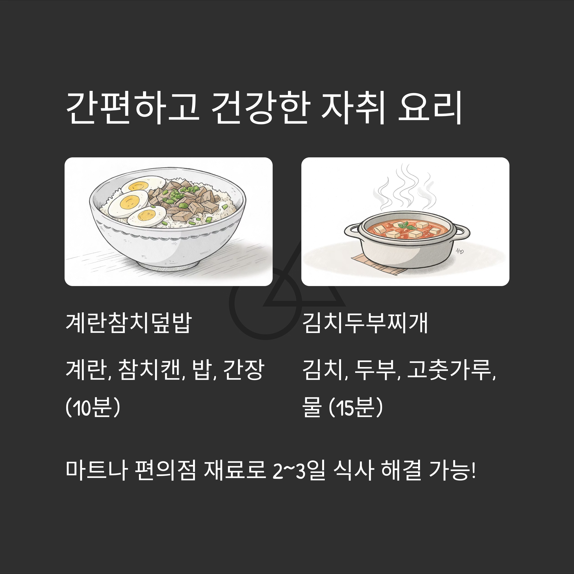 - 간편식 응용법, 기본 반찬, 초간단 요리 중심