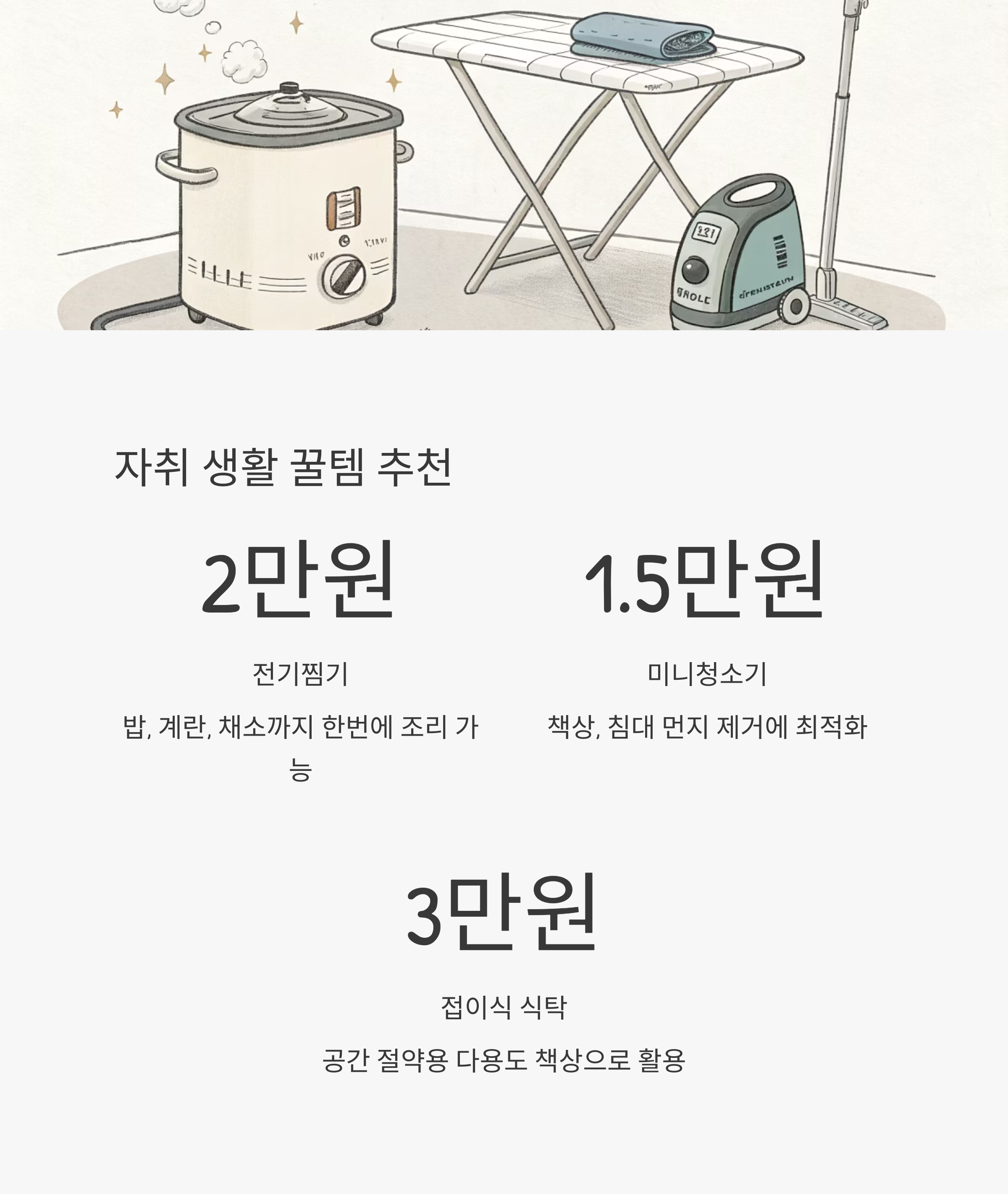 | 전기찜기 | 밥, 계란, 채소까지 한번에 | 약 2만원 |
