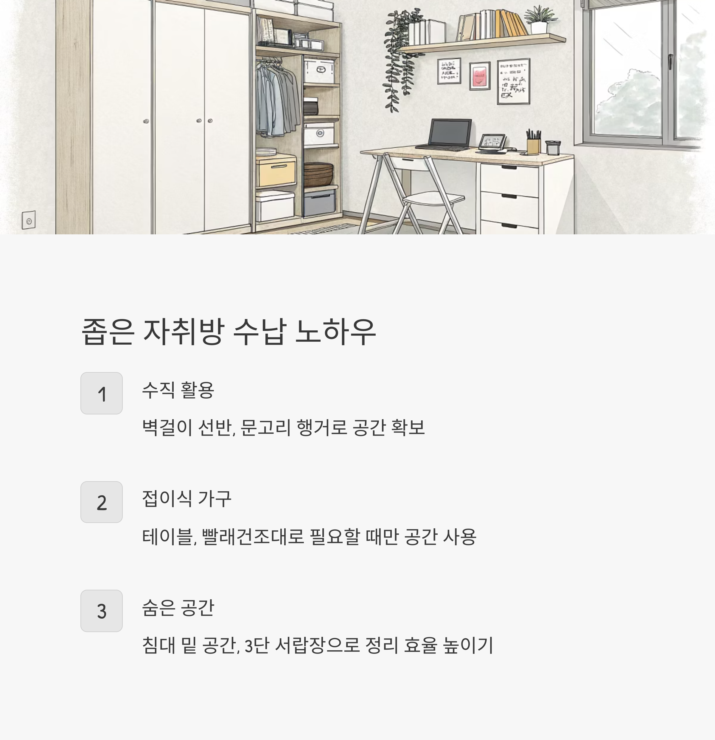 - 수직 수납을 활용하라 (벽걸이 선반, 문고리 행거 등)