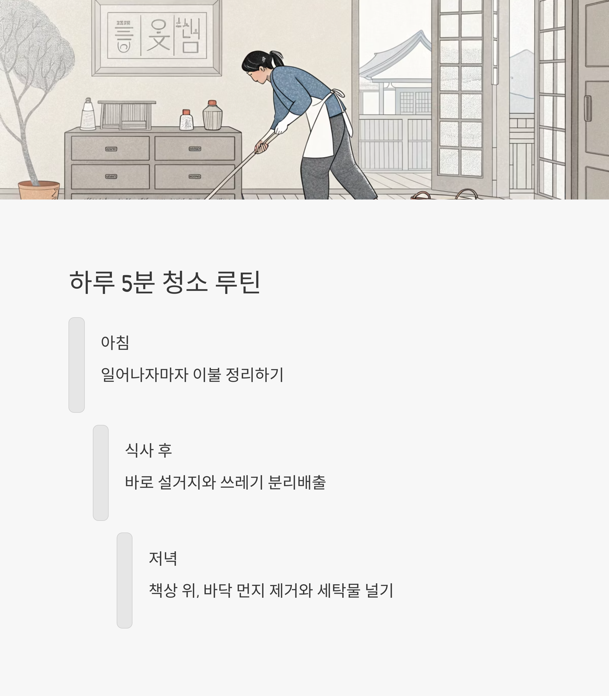 - 하루 한 가지 집안일 루틴 (청소, 빨래 등)