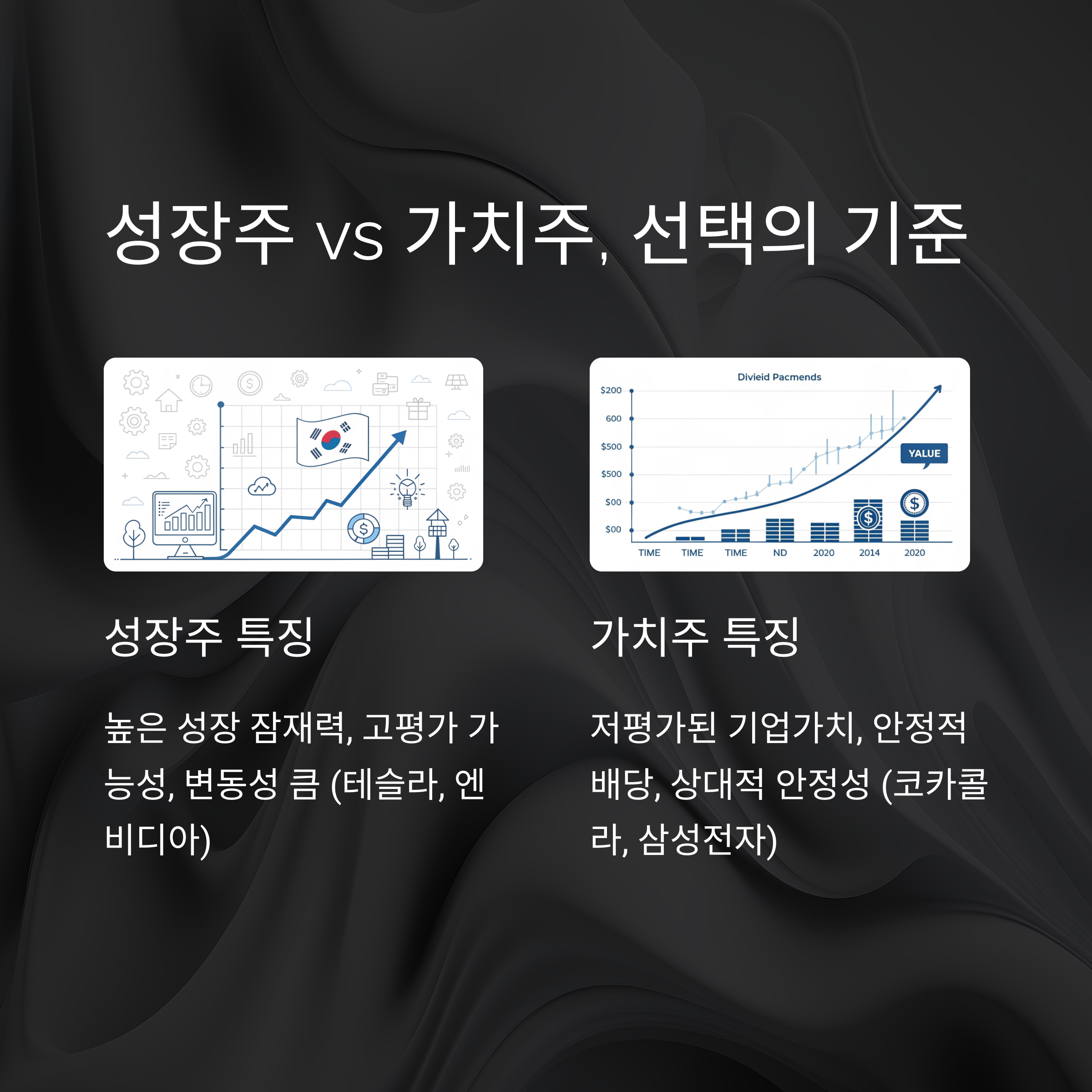 | 특징 | 고속 성장, 고평가 상태 | 저평가 상태, 안정적인 배당 |