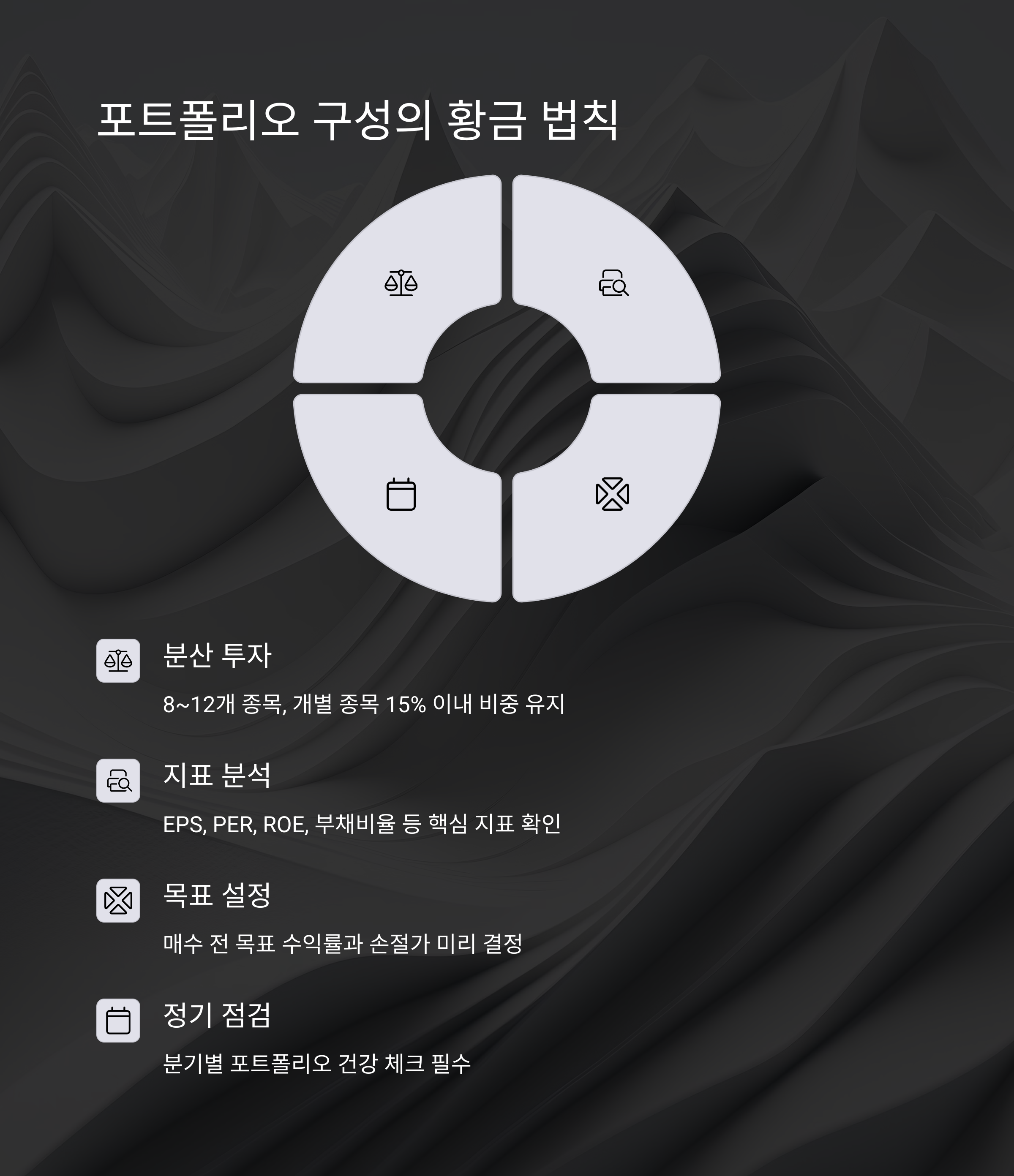연 1~2회 이상 포트폴리오 리밸런싱을 통해 비중이 높아진 종목을 매도하고, 저평가된 종목을 재편성하세요. 예를 들어, 성장주 비중이 전체 자산의 60%를 초과하면 일부를 배당주나 ETF로 전환해 리스크를 낮추는 식입니다.
