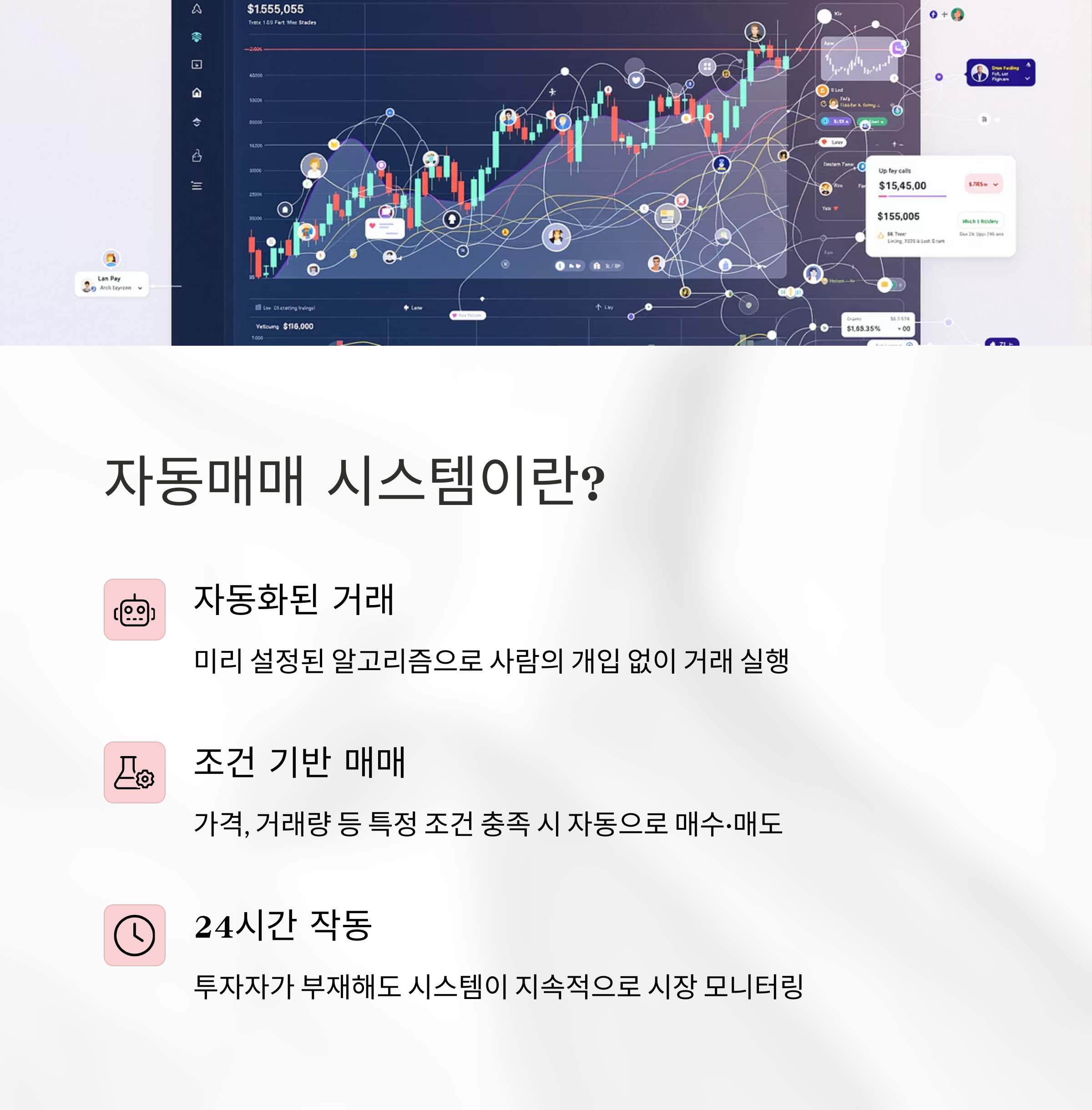 특정 가격에 도달하면 알림을 받고, 조건 검색을 하고, 매수/매도 타이밍을 계산하는 작업은 수동으로 하기 번거롭습니다. 자동매매 시스템은 이 모든 반복 작업을 자동으로 수행하며, 전략 설정만 잘 되어 있다면 최소한의 개입으로 지속 수익을 기대할 수 있습니다.