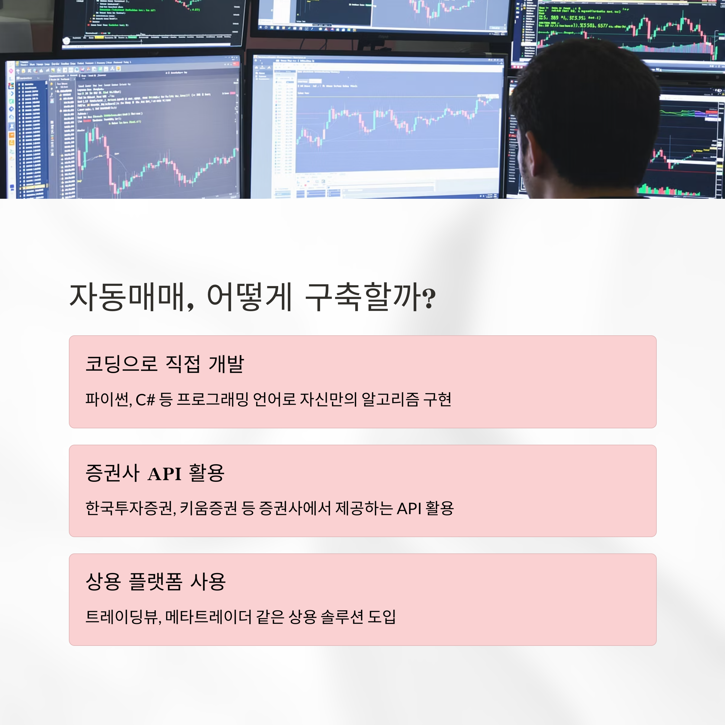 자동매매 시스템은 투자 경험이 충분하고 자신만의 전략이 명확한 사람에게 적합합니다. 코딩이 가능하거나 기술적 분석에 익숙하다면 자체 알고리즘을 개발하는 것도 좋은 방법입니다.