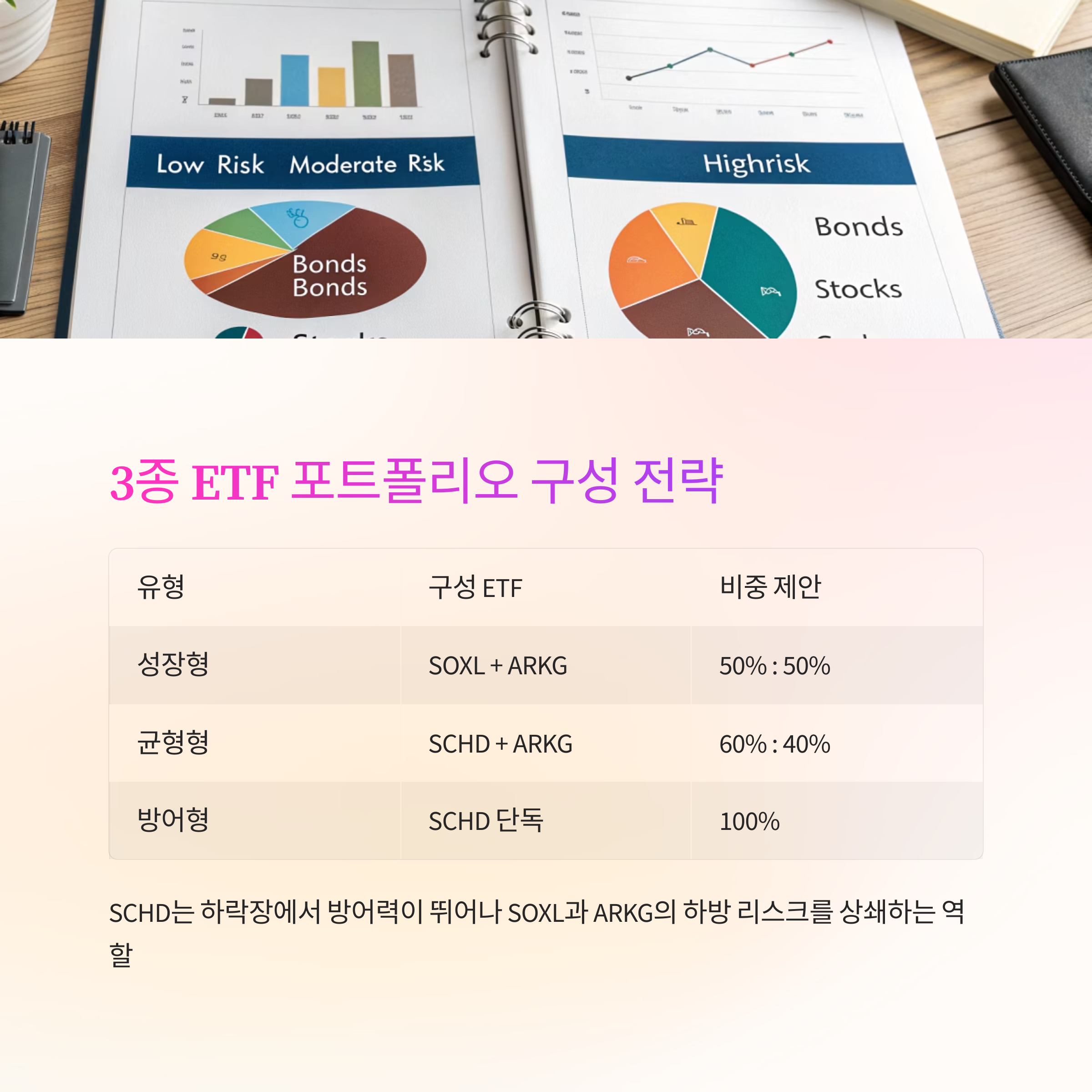 성장형 | SOXL + ARKG | 기술 혁신 중심, 고수익 추구 | SOXL 50%, ARKG 50% |