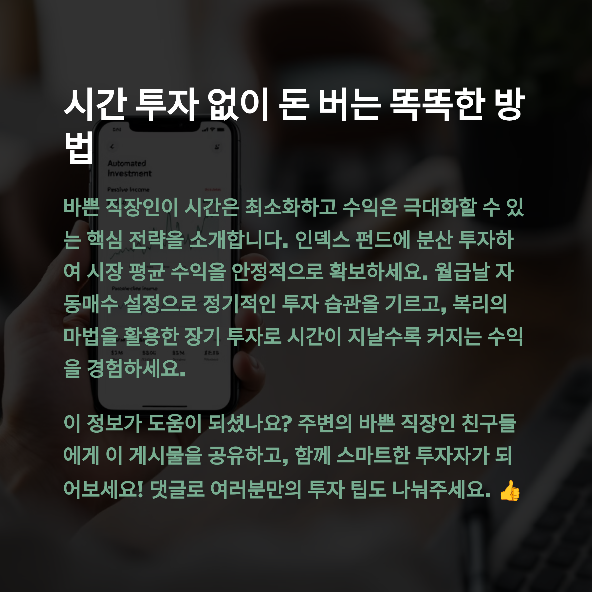 종목을 잘 고르는 것은 수익률과 직결됩니다. 하지만 직장인은 시간 제약이 있으므로 다음과 같은 전략을 추천합니다.