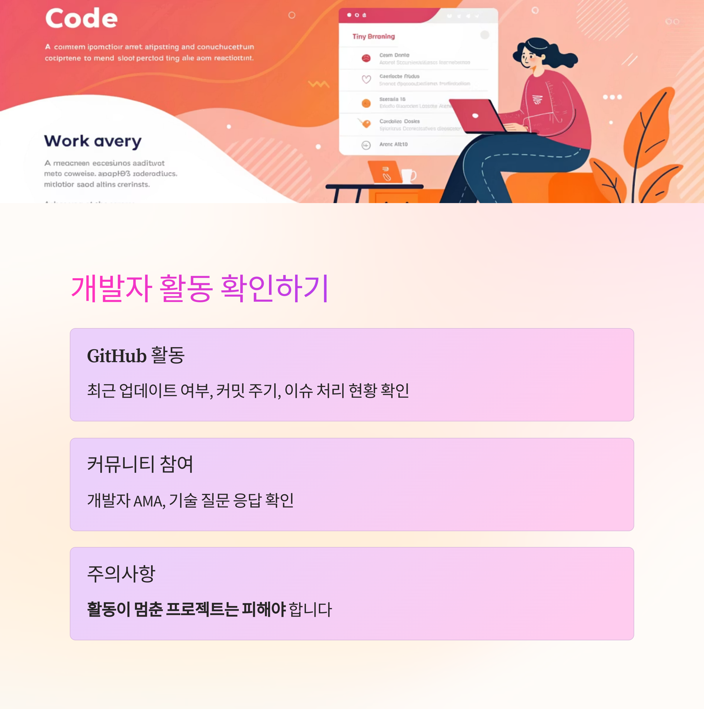 최근 업데이트 여부, 커밋 주기, 이슈 처리 현황 등을 확인할 수 있습니다.