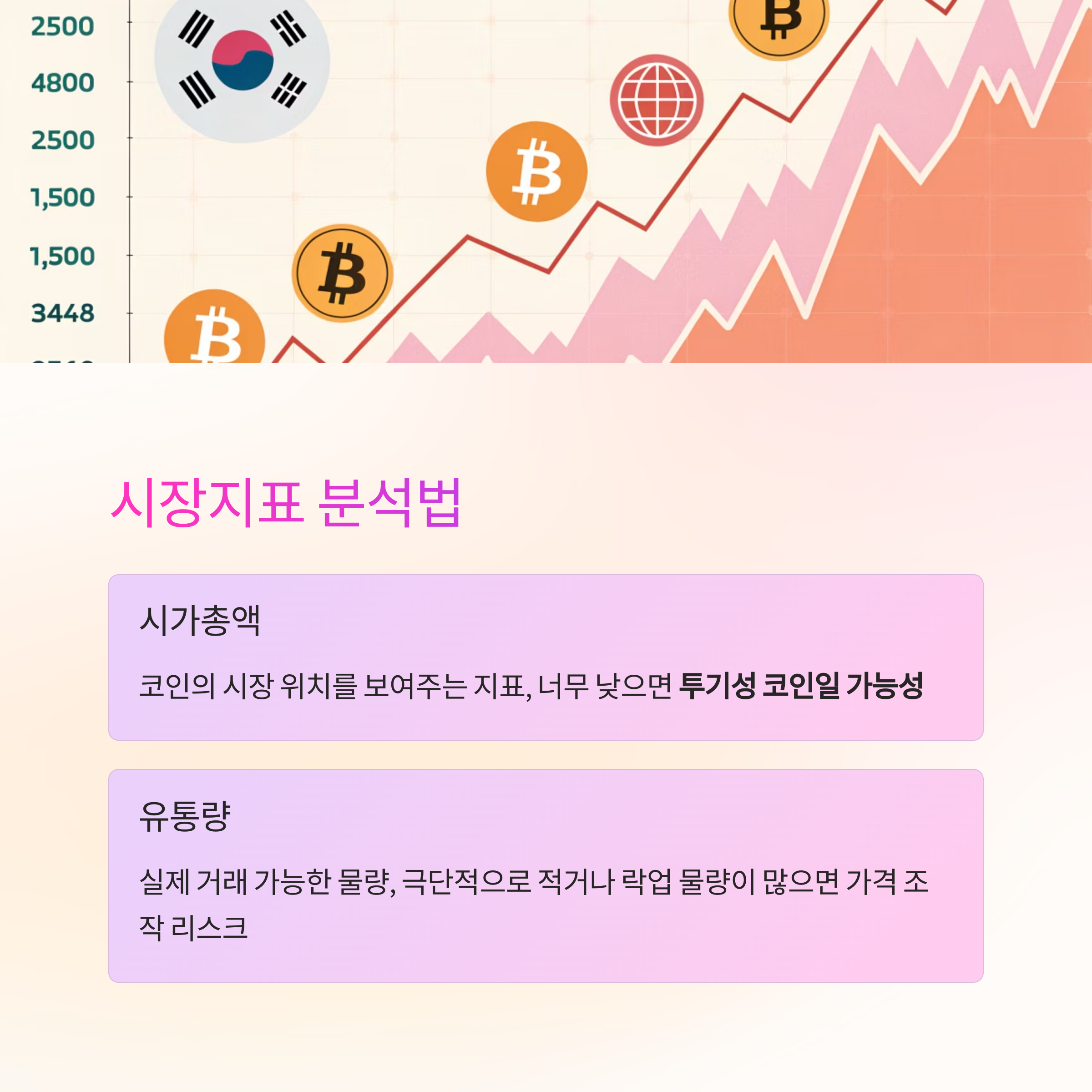 | 시가총액 | 코인 전체 가치를 달러화로 환산 | 너무 낮으면 회피 |