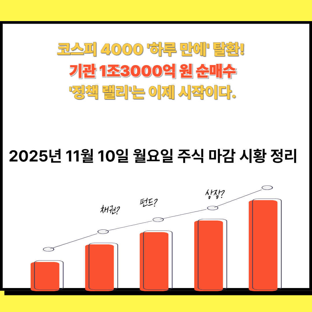 2025년 11월 10일 월요일, 시장이 말 그대로 폭발했습니다. 코스피가 무려 +3.02% 급등하며 4,073.24pt로 마감, 무너졌던 4천 선을 단 하루 만에 강력하게 되찾아왔습니다.
