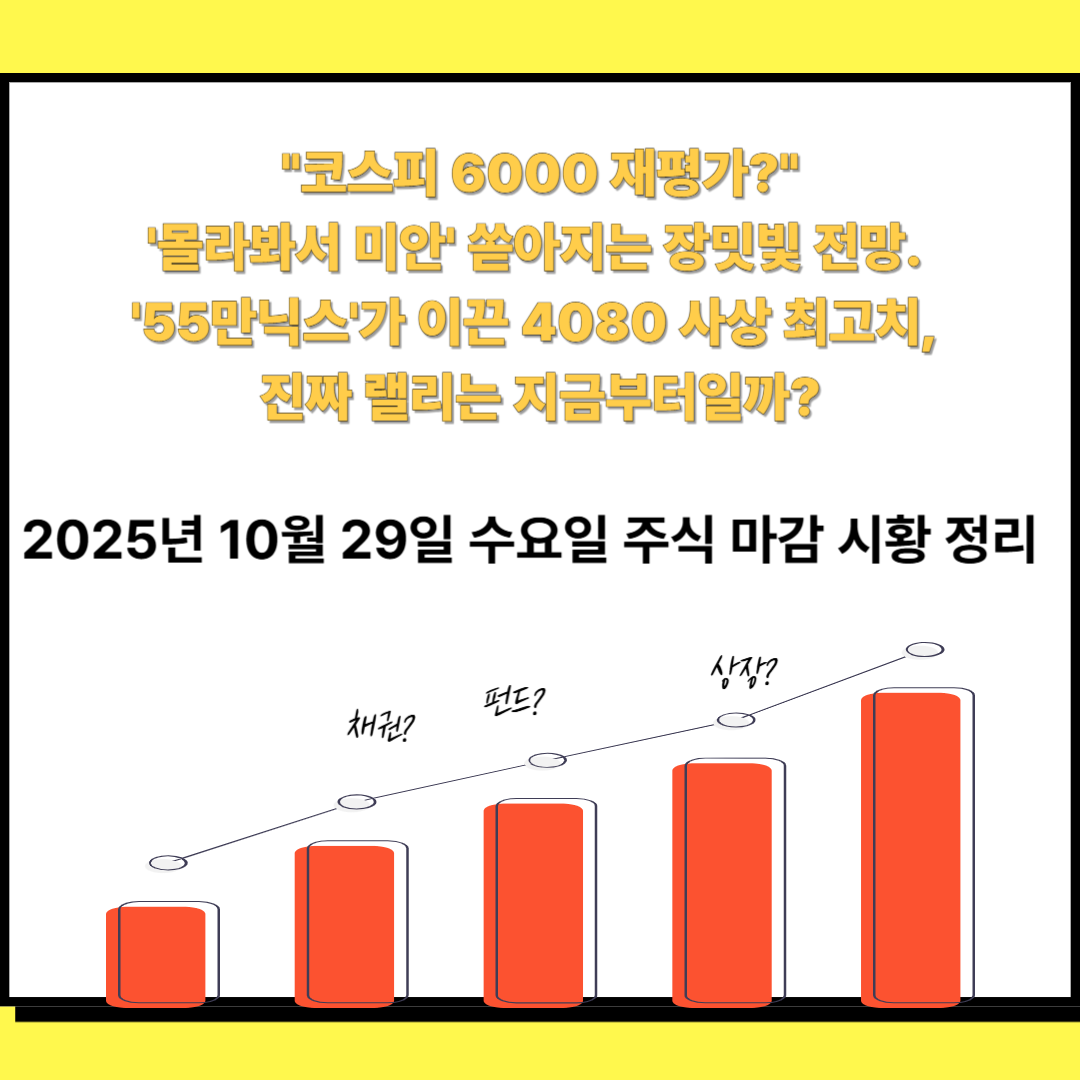 오늘의 핵심 이슈는 단연 SK하이닉스의 역대급 실적 코스피 사상 최고치 경신입니다. APEC 정상회담에 대한 기대감이 더해지며 시장은 그야말로 불을 뿜었습니다. "몰라봐서 미안하다", "6000까지 간다"는 식의 장밋빛 리포트가 쏟아지는 지금, 20년 넘게 시장을 봐온 저로서는 흥분과 동시에 냉철함이 교차합니다.