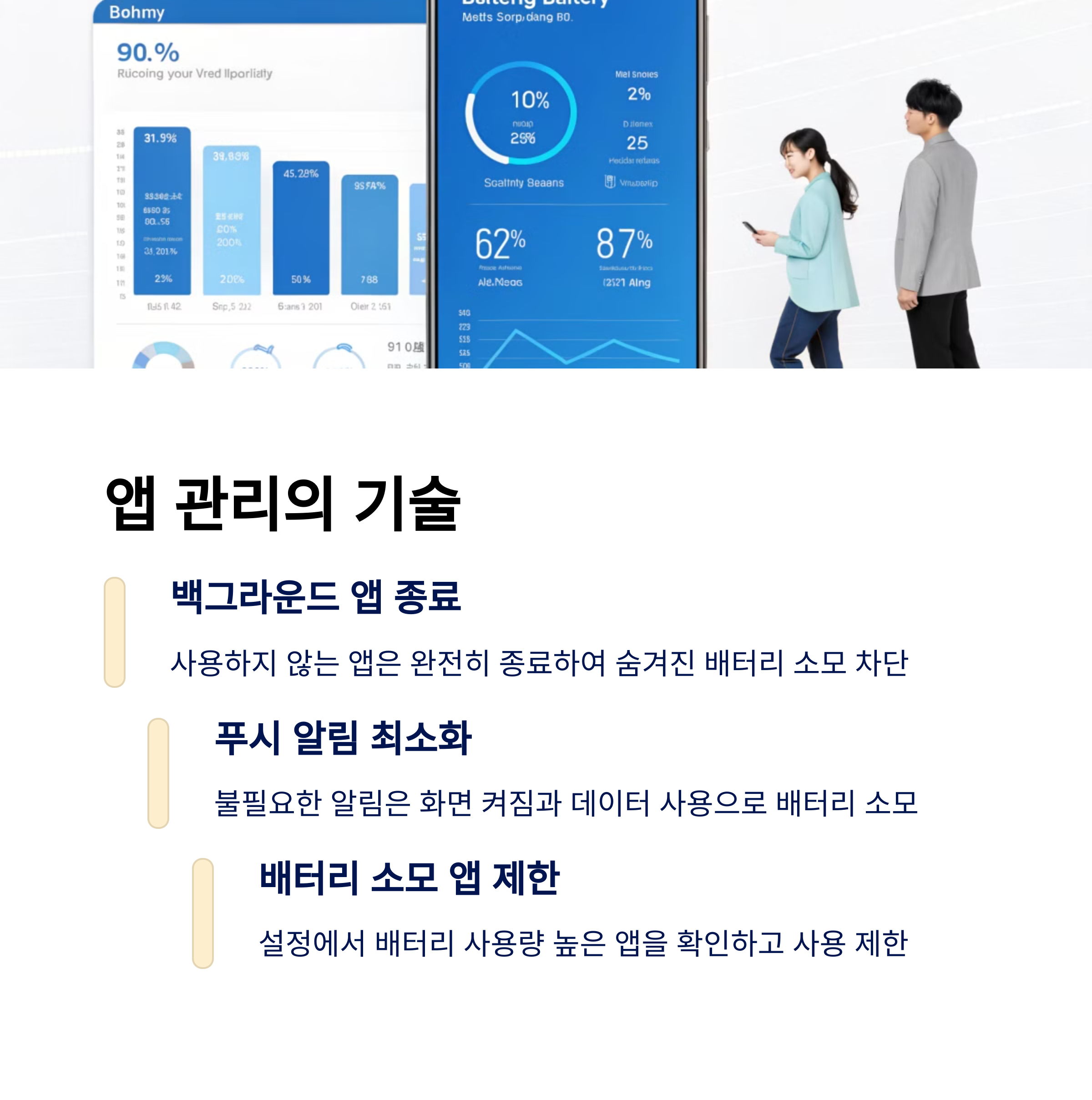 설정 > 배터리 > 앱별 사용량을 확인해보세요. 필요 없는 앱은 ‘절전 앱’으로 등록하거나 ‘백그라운드 사용 제한’을 설정해야 합니다. 알림이 불필요한 앱은 알림을 꺼두는 것만으로도 효과가 큽니다.