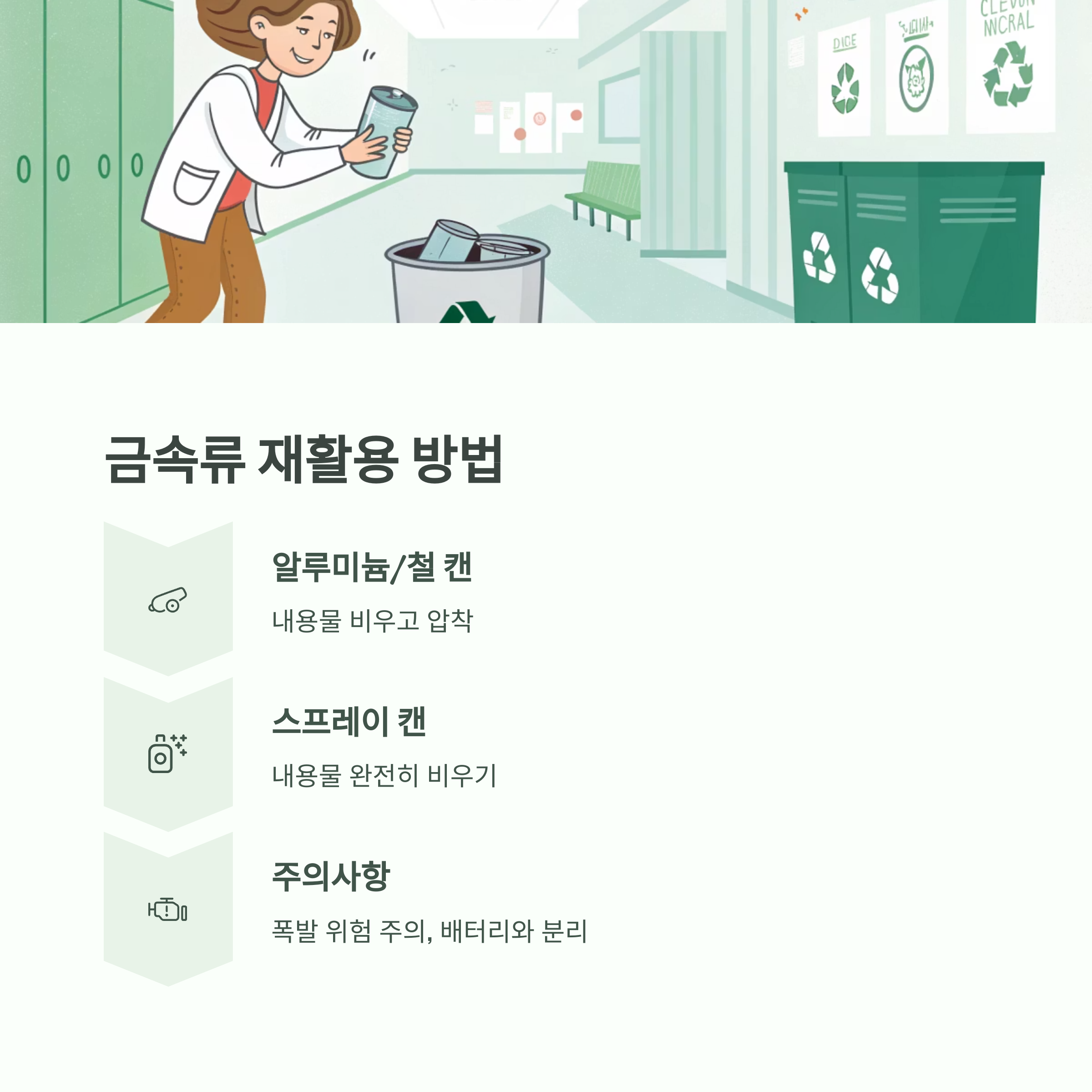 알루미늄 캔과 철 캔은 재활용률이 높아 반드시 분리수거해야 하며, 내용물을 비우고 깨끗이 세척 후 배출하는 것이 좋습니다.
