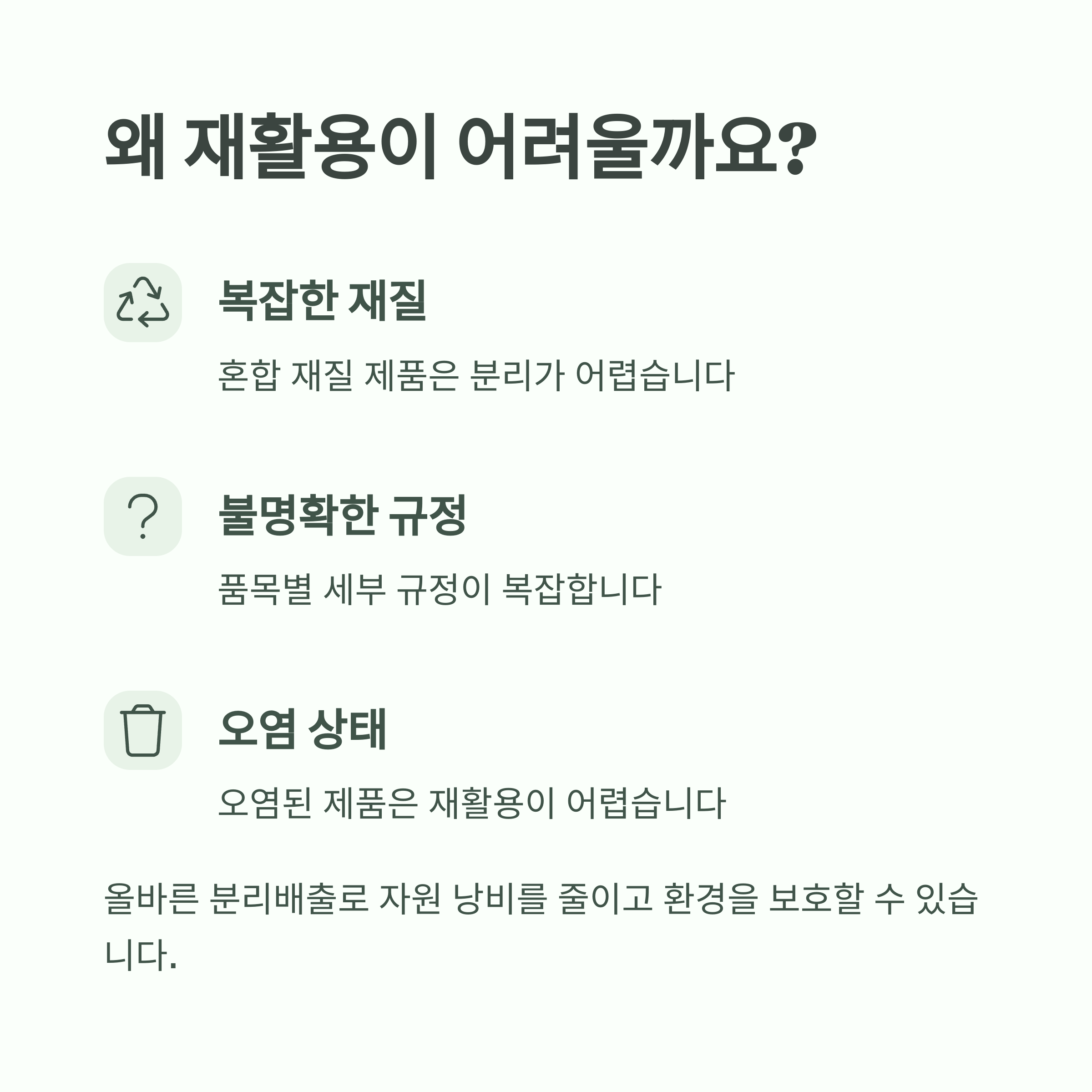 특히 재질이 혼합된 제품, 오염된 상태, 품목별 세부 규정 등이 복잡하여 정확한 분리배출이 어렵습니다.