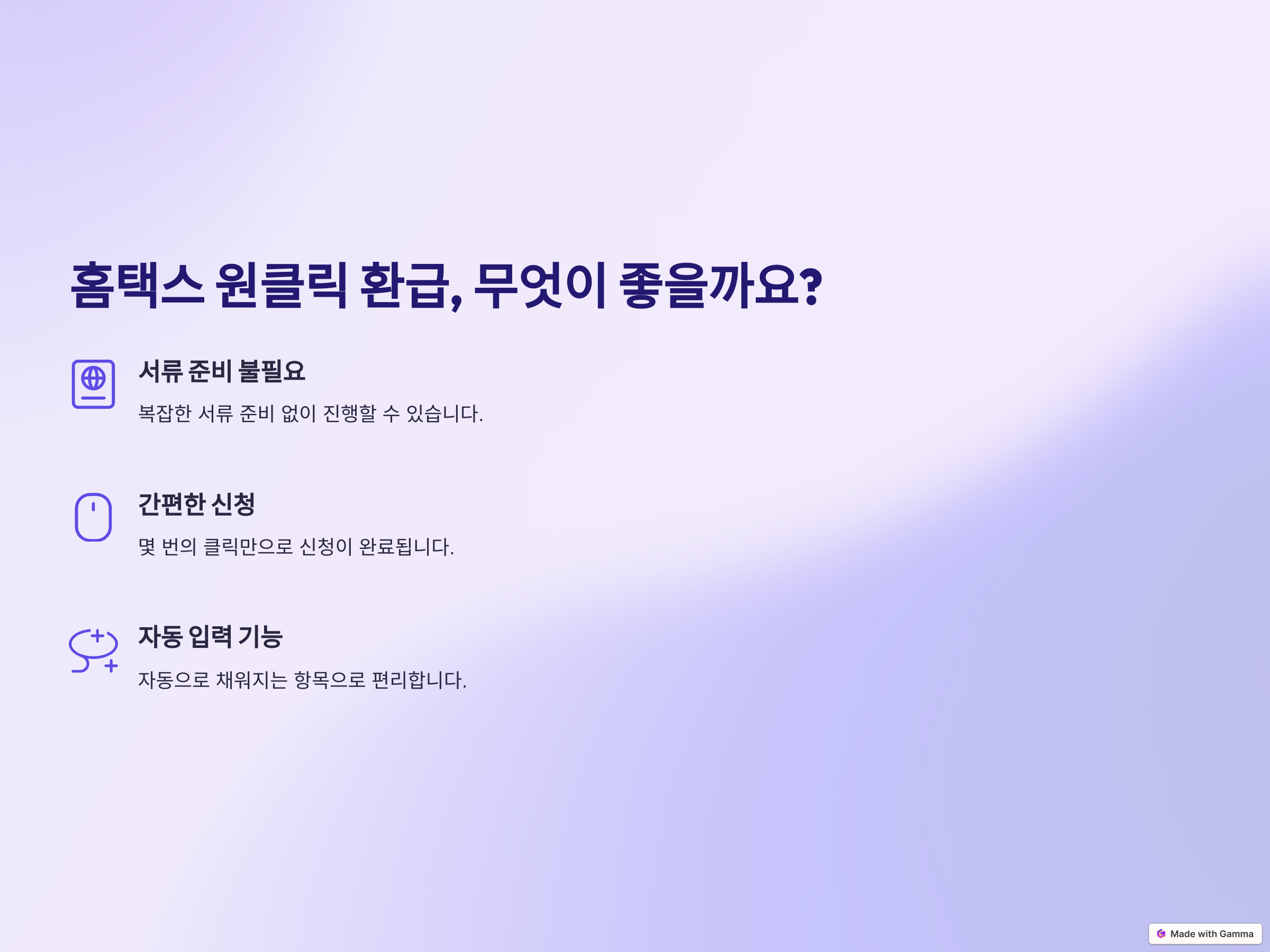 이전에는 여러 서류를 따로 확인하고 제출해야 했던 반면, 원클릭 환급은 데이터 기반으로 간편하게 처리되기 때문에 접근성이 뛰어납니다.
