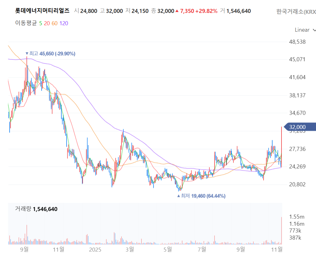 여러분, 오늘 주식 시장 보셨나요? 롯데에너지머티리얼(020150)이 장중에 무려 +29.82% (사실상 상한가) 폭등을 했습니다.