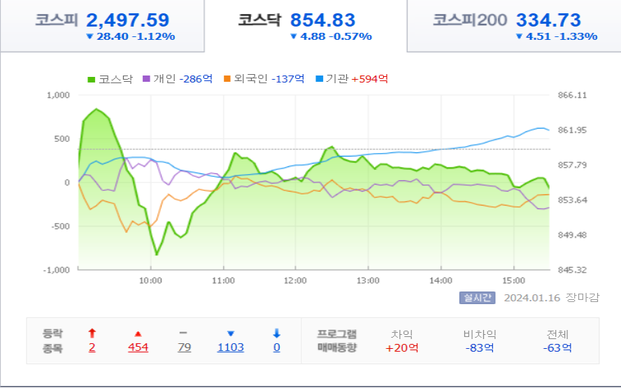 코스닥 지수는 854.83으로 0.57% 하락 매매동향은 외국인 137억 매도 기관에서는 594억 매수를 했습니다.