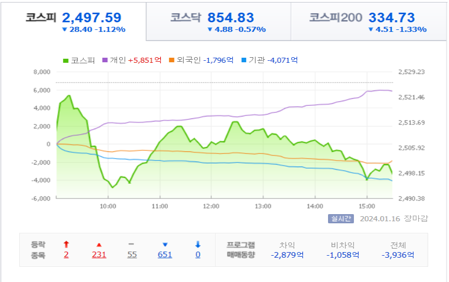지수가 60일선 부근에서 마감을 했습니다. 외국인 1796억 매도 기관이 4071억 매도를 하면서 1.12% 하락하면서 2497.59