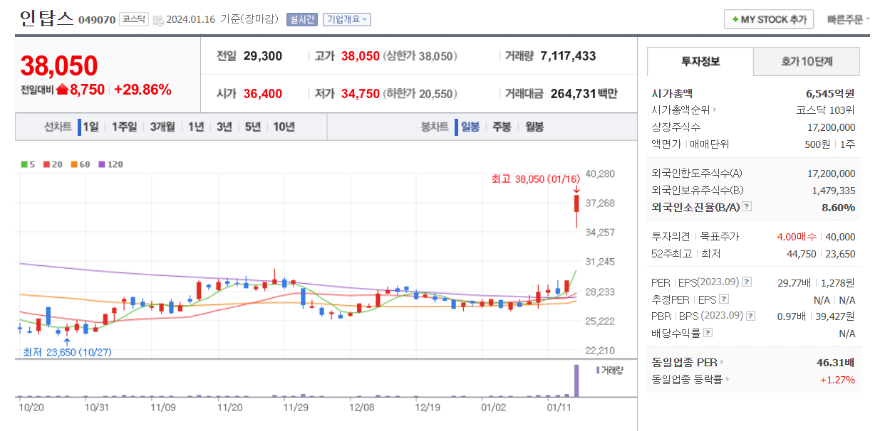어제 큰 상승 후 오늘 다시 큰 폭으로 상승하면서 상한가 마감했습니다.