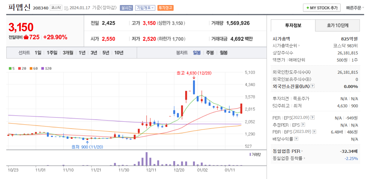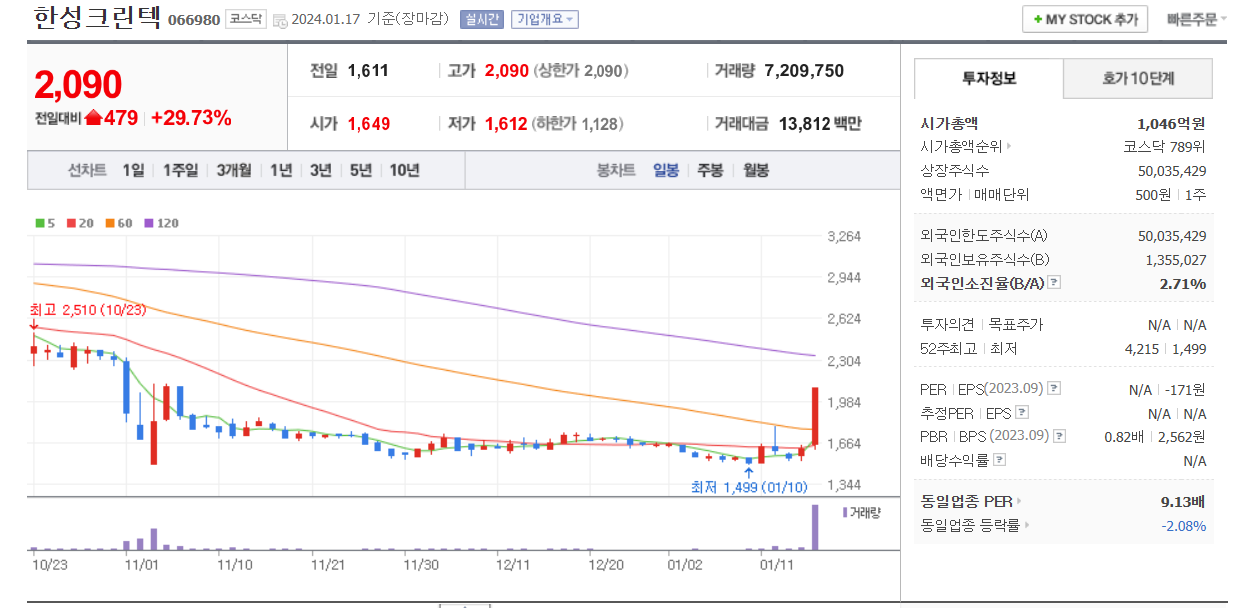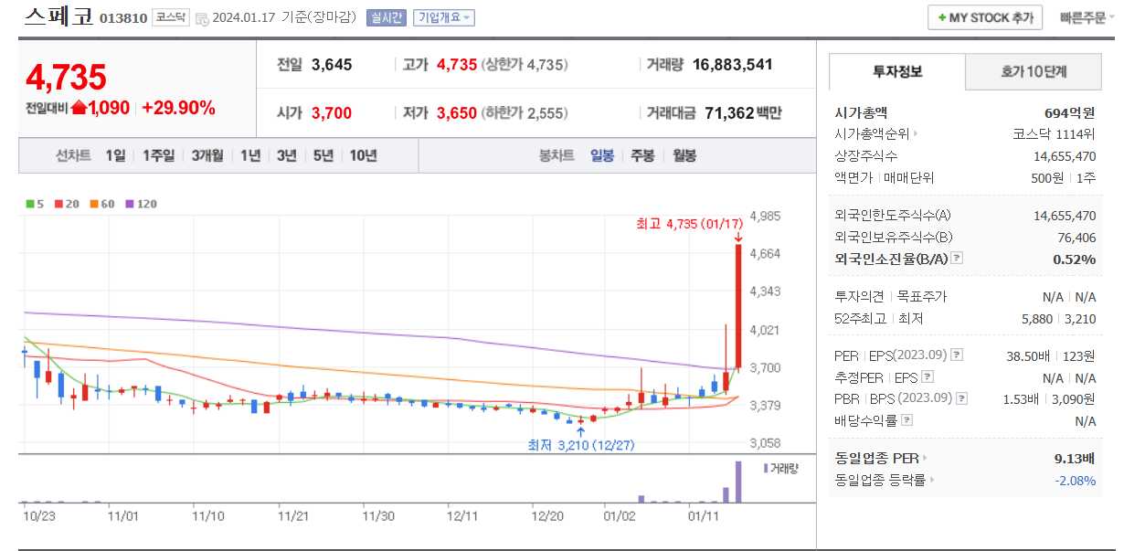 워낙 거래량이 적은 종목이라서 오늘은 평소보다 많은 거래량이 터져서 상한가 마감을 했지만
