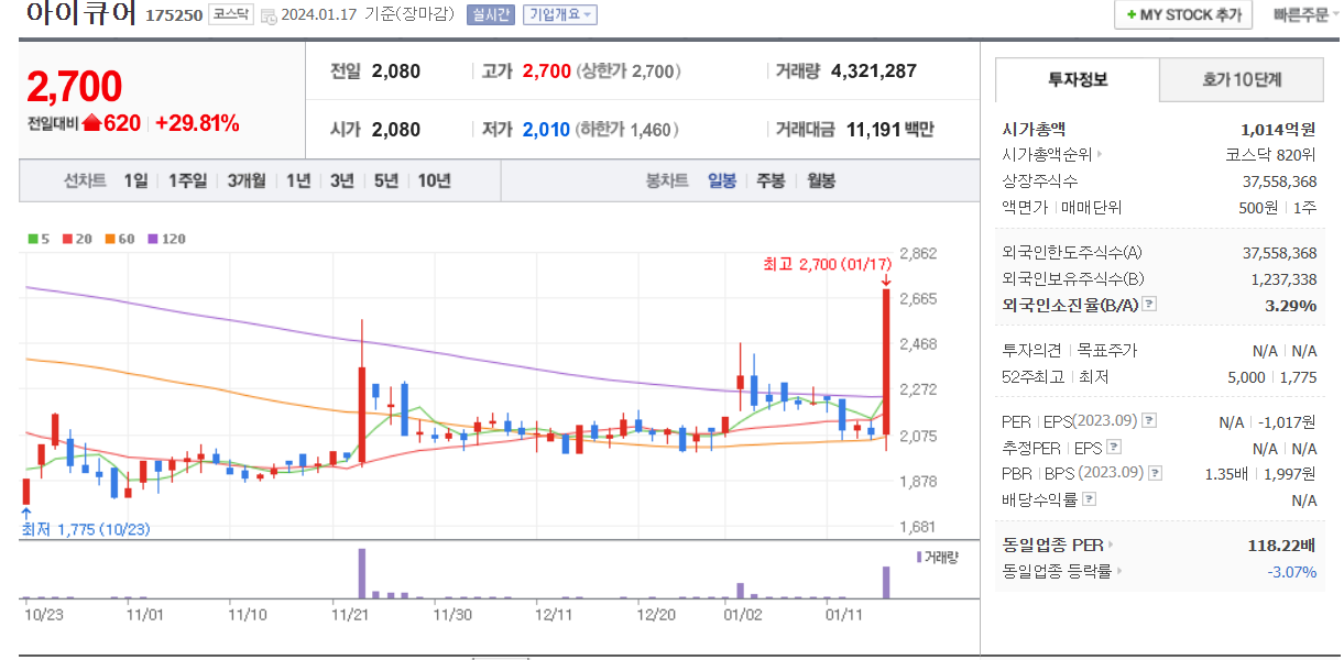 1월 17일 주식 상한가 종목