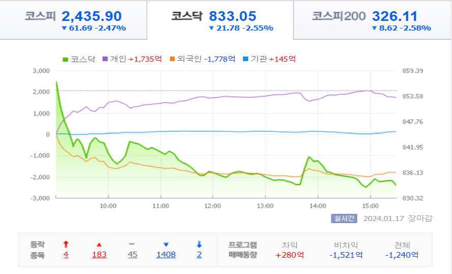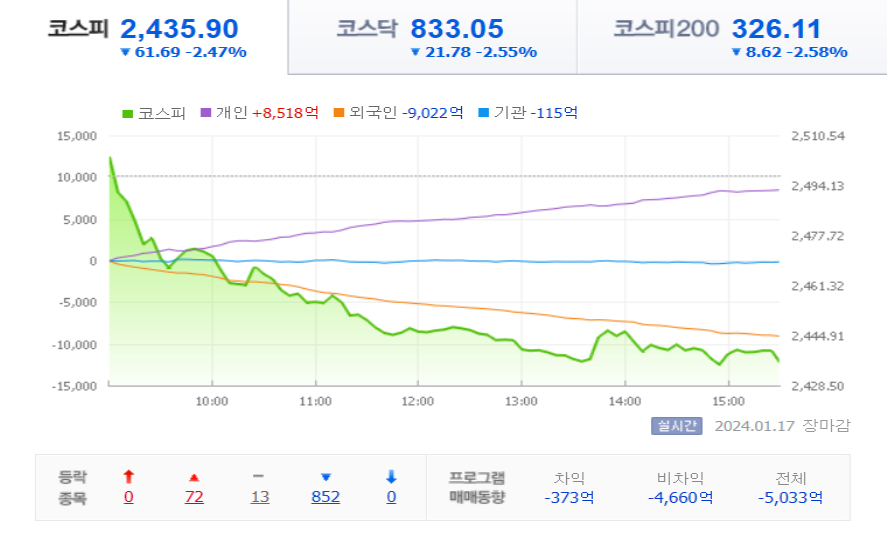 오늘 코스피 지수는 2435.90으로 -2.47% 하락  큰 폭으로 하락 마감했습니다.