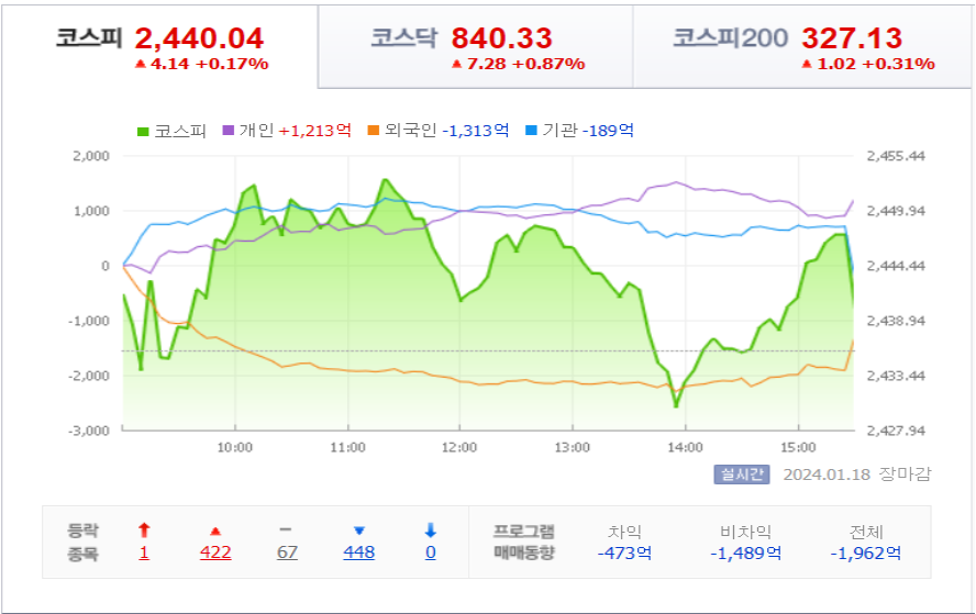 오늘 코스피 사장은 2440.04로 0.17% 오른 강보합 마감을 했습니다.