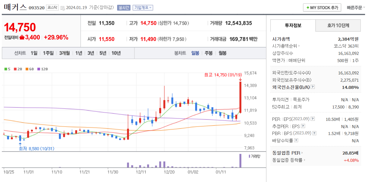 어제 큰 폭으로 상승에 이어서 오늘은 상한가로 마감을 했습니다.