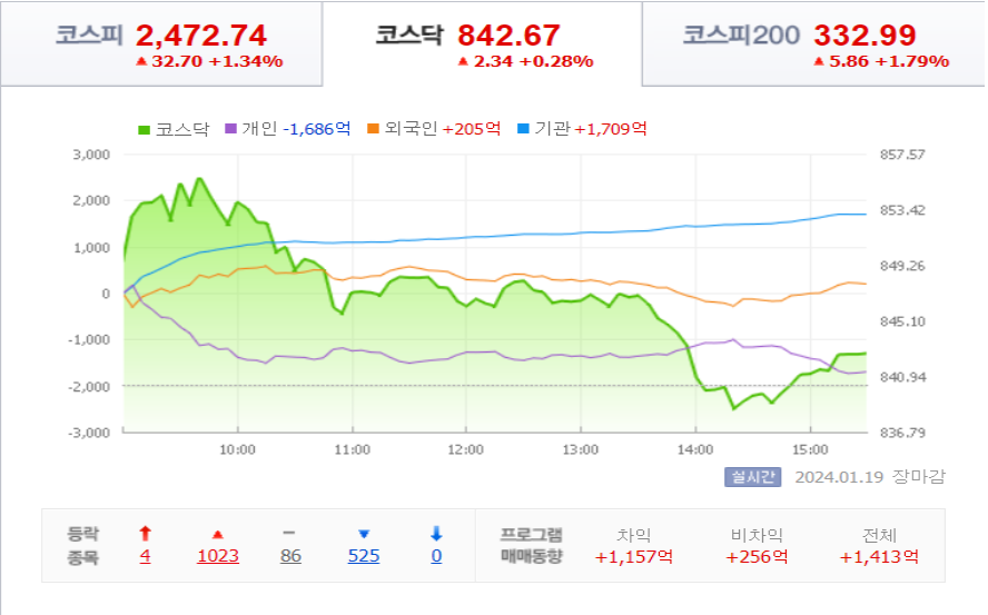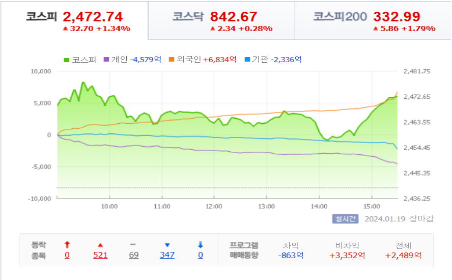 오늘 코스피 시장은 오래간만에 훈풍이 불어서 2472.74로 1.34% 상승 마감했습니다.