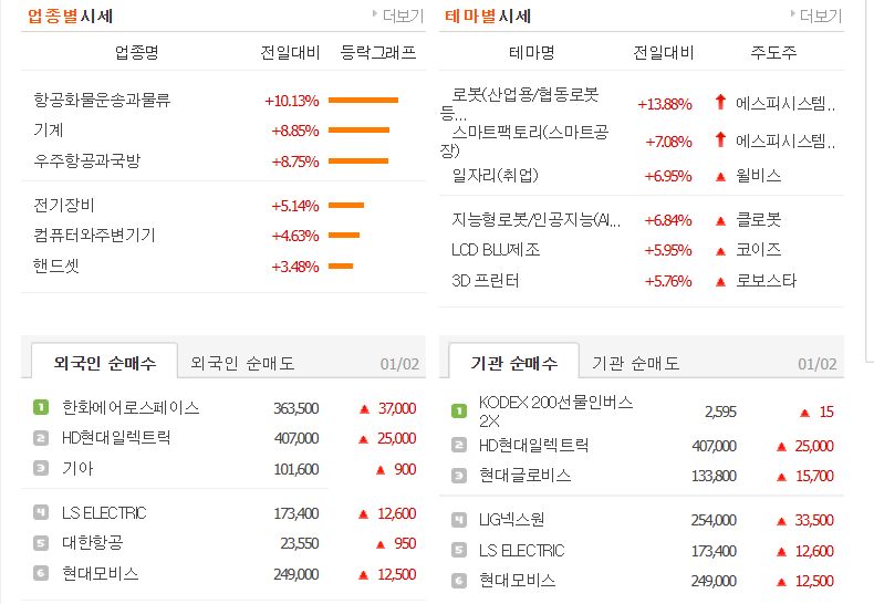외국인순매수 상위종목에서는 방산주, 전력주, 항공주, 자동차등을 매수했고 기관에서도