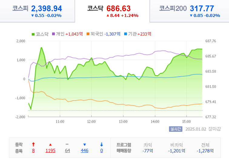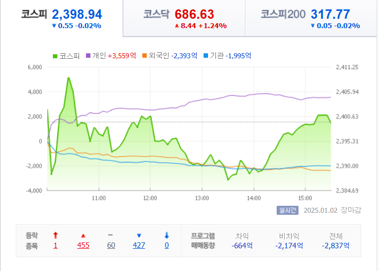 오늘 코스피 지수는 새해첫날 증시에서 외국인과 기관 매도로 하락마감했네요.