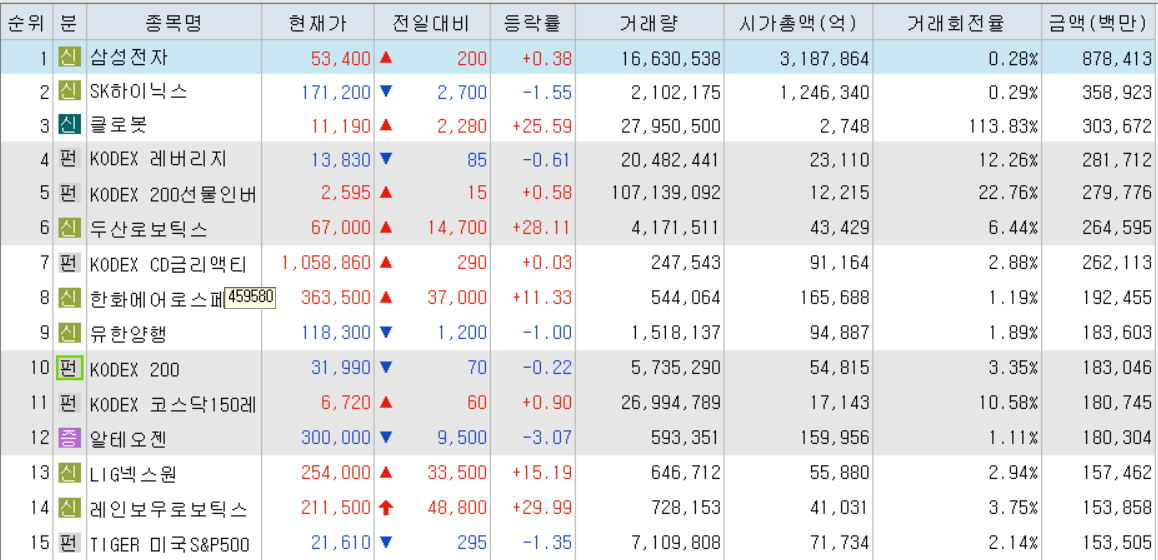 오늘 거래대금 상위종목에서는 로봇 관련주 클로봇, 두산로보틱스, 레인보우로보틱스, 에스피지, 등이 크게