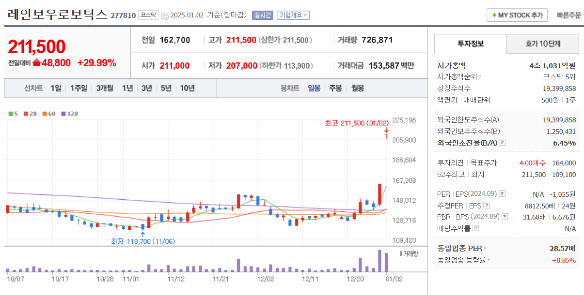 가지고 있기 때문에 오늘 삼성전자와 레인보우로보틱스 이슈로 인해 관련주로 상한가 마감했네요.