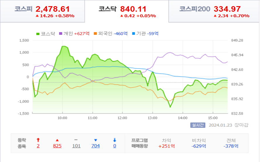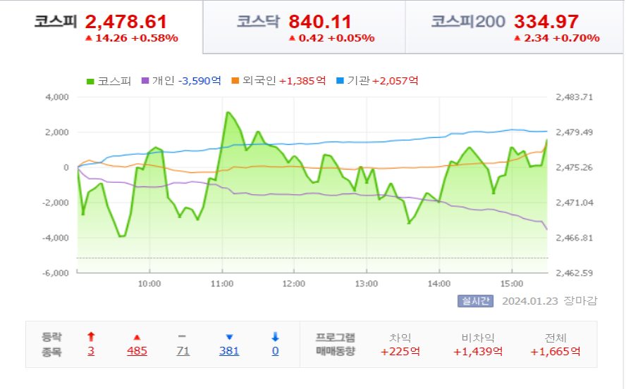 코스피는 23일 전거래일 대비 14.26포인트(0.58%) 오른 2478.61에 마감을 했습니다.